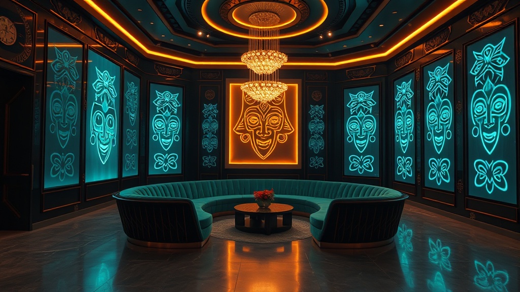 Afrofuturist Deco merges the sleek geometric forms of Art Deco with the futuristic themes and cultural pride of Afrofuturism. It's about creating a space that is both stylish and empowering, celebrating Black identity and envisioning a technologically advanced future.