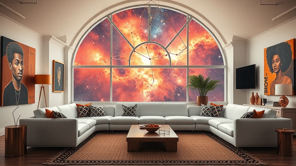 A fusion of futuristic aesthetics and African cultural heritage. It combines sleek, contemporary forms with bold colors, geometric patterns, and natural elements inspired by the African diaspora.