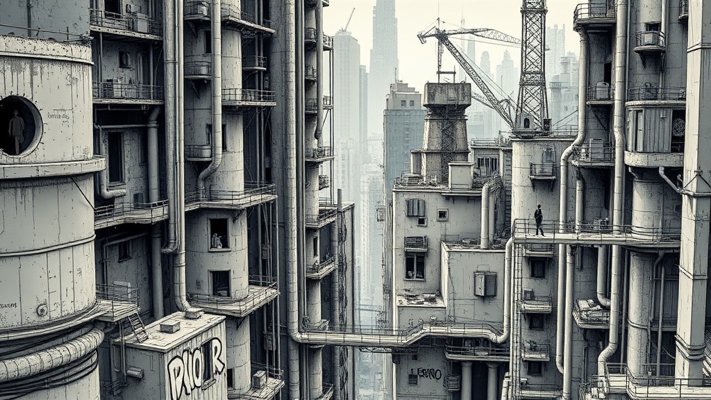 - Textural Contrast: Juxtaposes smooth concrete textures with the intricate details of illustrative linework.