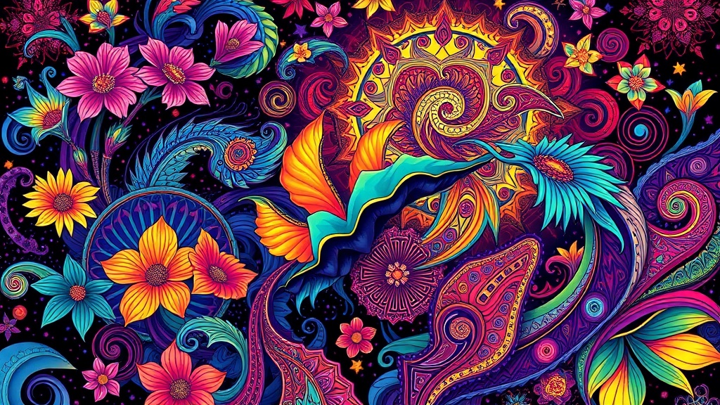 - Psychedelic Colors: Uses bright, saturated colors and hallucinatory patterns to create a sense of altered perception.