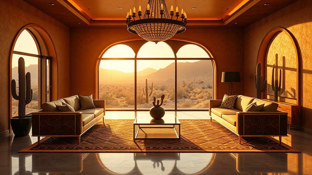 Desert Art Deco merges the geometric glamour of Art Deco with the natural beauty and earthy tones of the desert, creating a sophisticated and unique style.