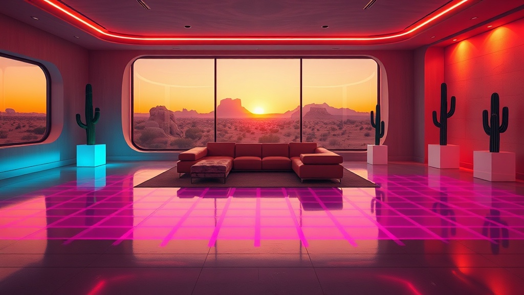 - Synthwave Color Palette: Dominated by electric blues, hot pinks, vibrant purples, and sunset oranges, reminiscent of 80s synthwave album covers, contrasting against a neutral desert backdrop.