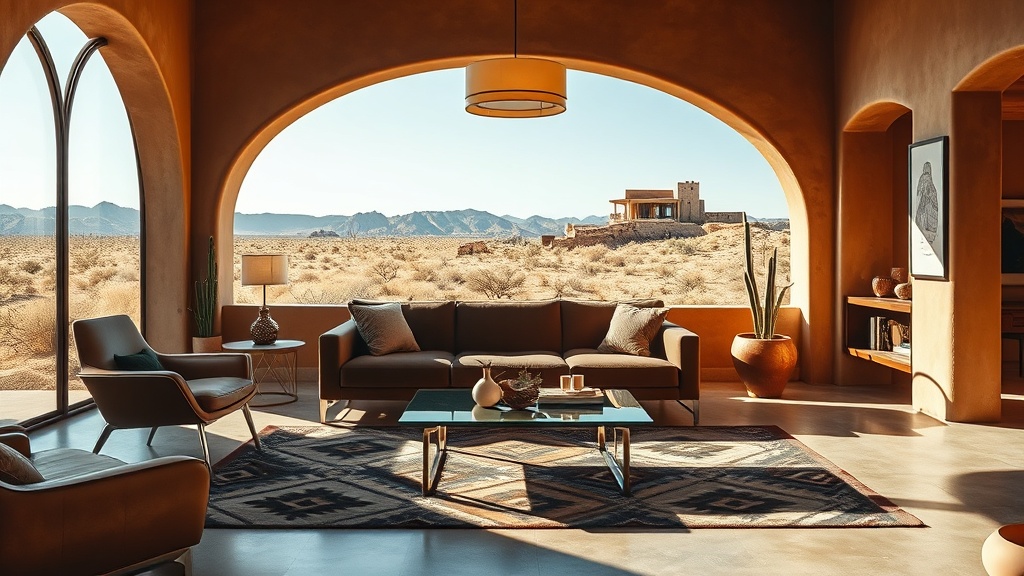 This style combines the geometric motifs and luxurious materials of Art Deco with the rustic textures and organic shapes of a ranch-inspired design, perfectly suited for desert environments.