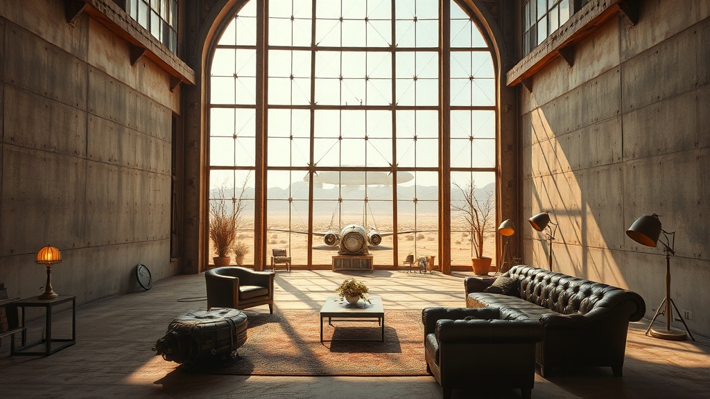 - Décor: Add decorative objects that reflect the Dieselpunk aesthetic and desert environment, such as vintage maps, aviation memorabilia, automotive parts, and cacti or succulents in metal pots.