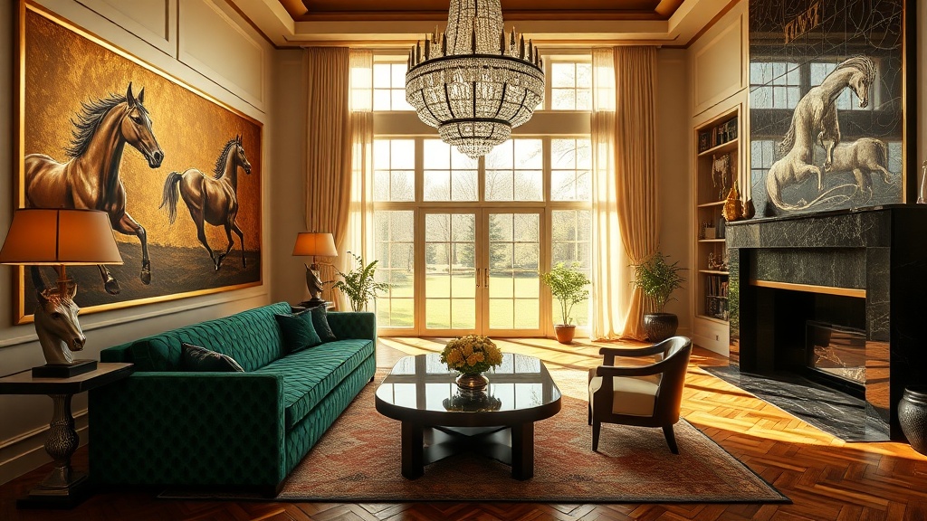 - Accessories: Equestrian artwork, vintage riding equipment, and Art Deco-inspired lighting.