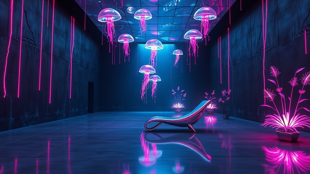 - Luminous Lighting: Utilize LED lighting to create a soft, ambient glow, emphasizing both neon vibrancy and subtle, dreamlike illumination.