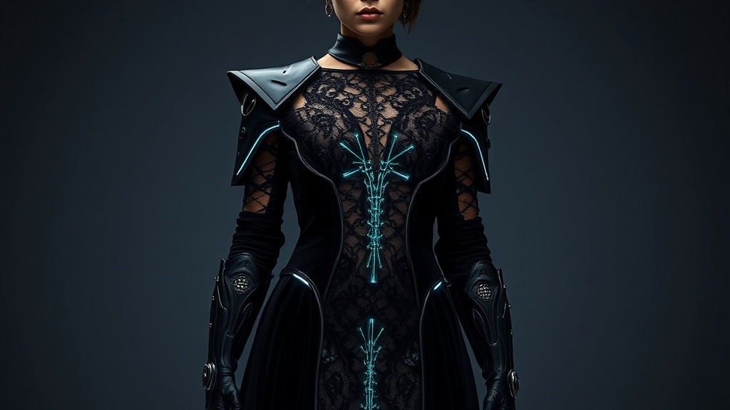 - Gothic Silhouettes: Corsets, long coats, and flowing gowns adapted with futuristic cuts and details.