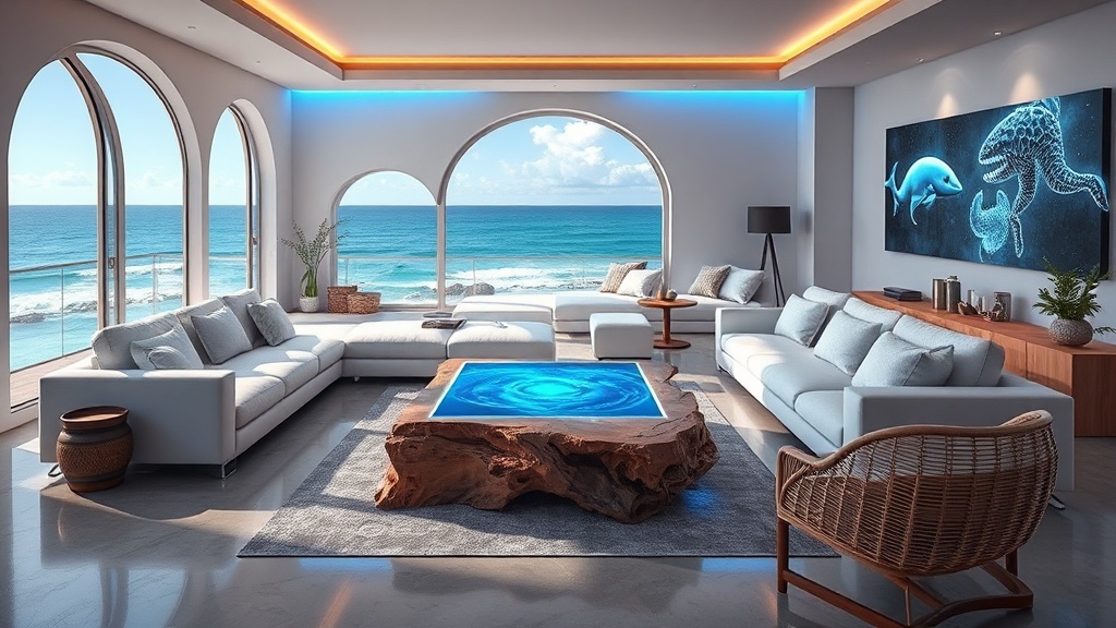 - Furniture: Choose comfortable, coastal-inspired furniture with clean lines and natural materials, but add metallic accents or futuristic details.