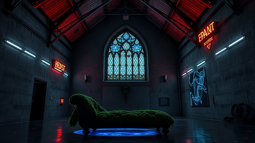 - Gothic Architecture Elements: Pointed arches, vaulted ceilings, stained glass (or holographic projections mimicking stained glass), and gargoyle-inspired details are incorporated into the space.