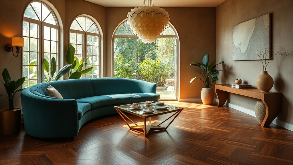 - Incorporate Art Deco Geometry: Introduce geometric patterns and shapes through textiles, wallcoverings, or furniture designs. Soften these with natural curves and flowing lines.