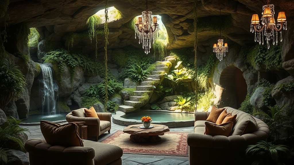 - Hidden Lighting: Subdued lighting to highlight the natural textures and create a sense of mystery.